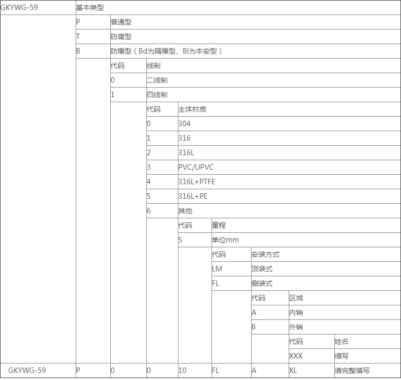 如上表實(shí)例:GKYWG-59/P0010FLAXL,P代表普通型,第I個(gè)0代表二線制,第II個(gè)0代表304材質(zhì),1代表10m量程,F(xiàn)L代表法蘭安裝,7m代表罐高,A代表內(nèi)銷,XL代表徐亮的訂單。