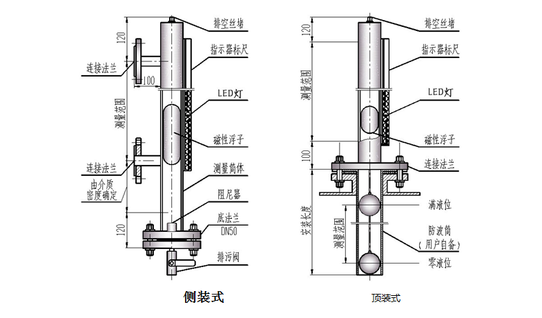 磁敏液位計(jì)有兩種安裝形式滿足用戶需求,包括:頂裝式、側(cè)裝式。